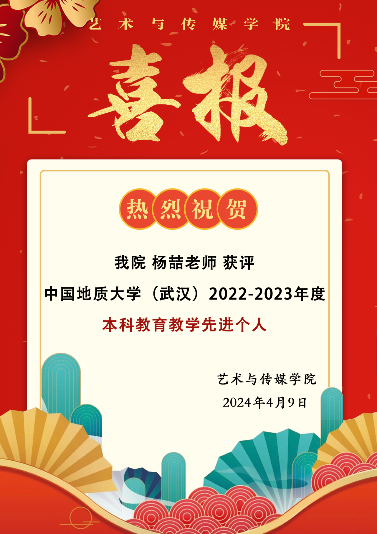 喜报|热烈祝贺我院杨喆老师获评学校2022-2023年度本科教育教学先进个人!
