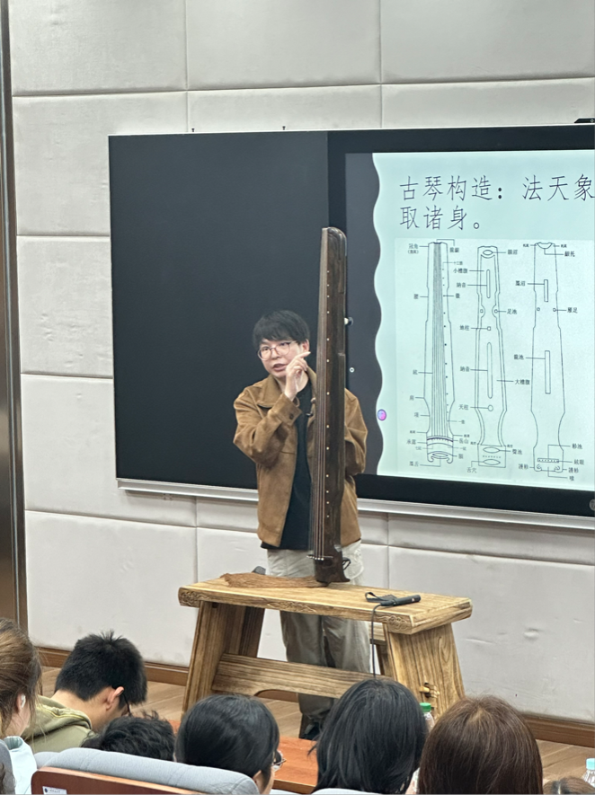 讲座开始,陈宜外老师详细介绍了古琴的历史沿革。他提到,湖北地区在古琴发掘方面有着悠久的历史,古琴早出现在宫廷音乐与祭祀音乐之中,成为中国古代音乐文化的重要组成部分。而在谈及古琴常识时,陈老师从古琴的构造、音色、演奏技巧等方面进行了详细讲解,他指出,古琴的音色独特,具有“清、和、淡、雅”的特点,能够表现出丰富的情感与意境。随后,陈宜外老师深入探讨了古琴文化的哲学艺术性。他认为,古琴艺术不仅体现了中国古代音乐文化的精髓,更蕴含了丰富的哲学思想和人文精神。