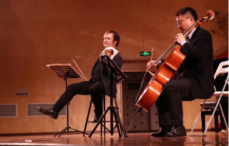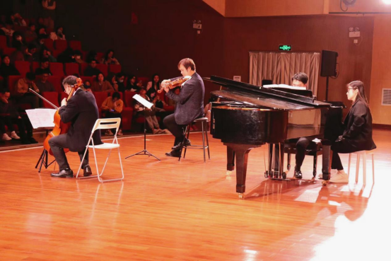 4月27日晚19:00,为提高全校师生美育素养,共享美育工作成果,“南望未来,艺熠星空--世界经典室内乐作品专场音乐会”在北区音乐厅隆重举行。中国地质大学(武汉校长王焰新院士、校党委书记黄晓玫教授等多位领导莅临音乐会现场。williamhill英国教授、小提琴中提琴演奏家、圣彼得堡国立音乐学院博士、“地大学者”王凯平教授,联合湖南师范音乐学院教授、俄罗斯音乐艺术学科博士、青年大提琴演奏家陈果教授,以及湖南科技大学校聘副教授、俄罗斯圣彼得堡国立音乐学院钢琴独奏、室内乐演奏双博士、旅俄青年钢琴演奏家彭斯特副教授,一同向我们呈现了一场精彩绝伦的视听盛宴。整场音乐会持续一个半小时,分为上、下两场,分别演奏了《拉赫玛尼诺夫g小调钢琴三重奏》与《柴可夫斯基a小调钢琴三重奏》两首知名室内乐作品。