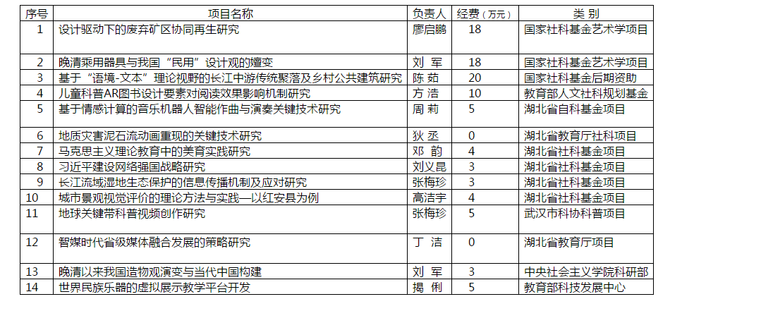 我院一直重视科研实力的提升,在申报项目时通知动员及时到位,申报过程中跟踪服务到位,在制定学院绩效考核时强调以学术成果为导向的评价体系,经过全院教职工共同努力,今年在纵向科研项目获批的数量、级别和经费方面均实现历史突破,共获各类纵向项目14项,其中国家社科基金艺术学项目3项,教育部社科规划基金1项,国家其他部委项目2项,湖北省社科基金4项,湖北省自科基金1项,湖北省教育厅项目2项,武汉市科协项目1项 ,到位经费98万元。