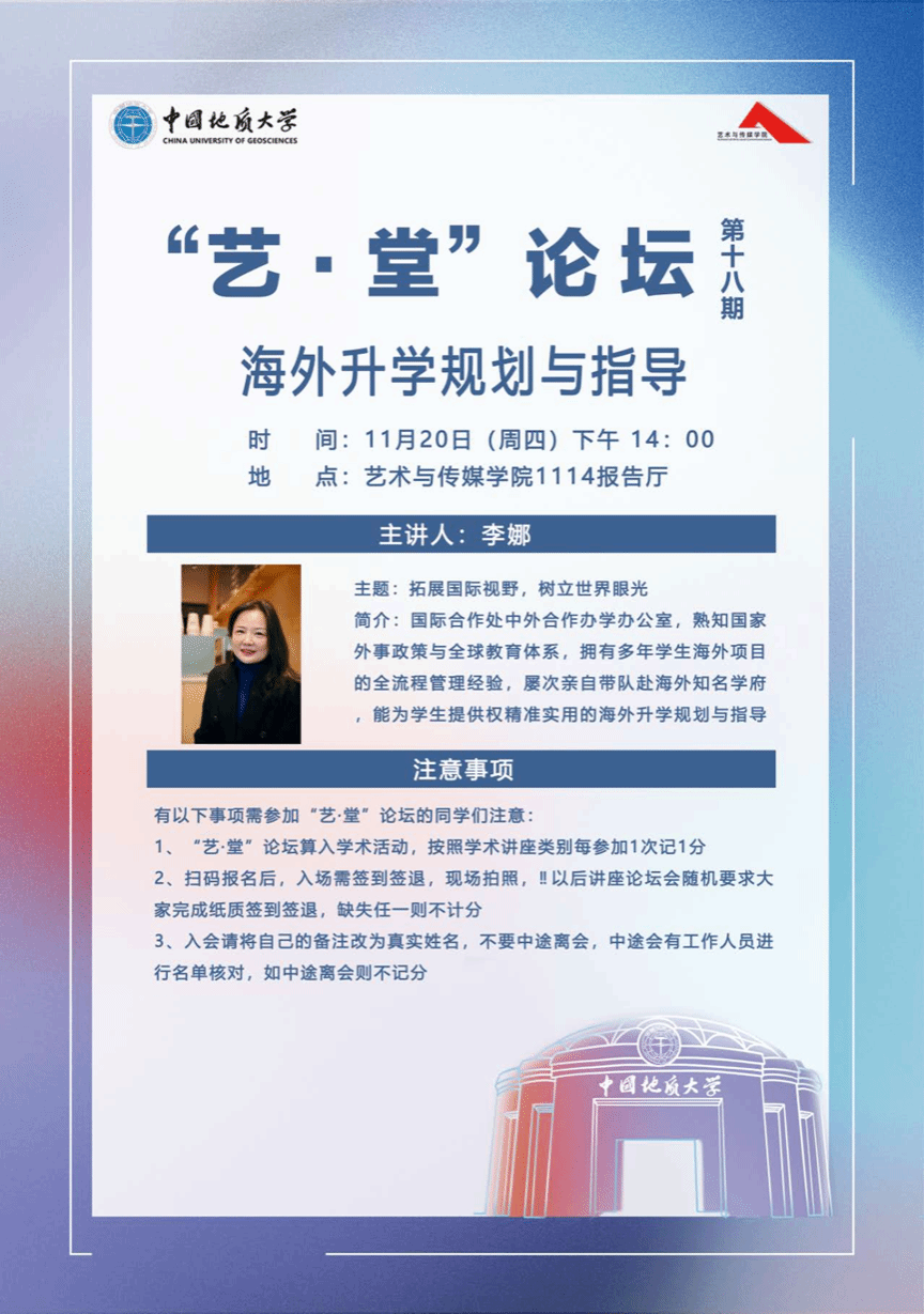 2025年11月20日下午,“艺·堂”论坛第十八期(学风建设系列第十期)在williamhill英国1114报告厅顺利举行。本次论坛以“拓展国际视野,树立世界眼光”为主题,邀请国际合作处中外合作办学办公室李娜老师担任主讲人,为同学们带来了一场干货满满的海外交流项目指导分享。