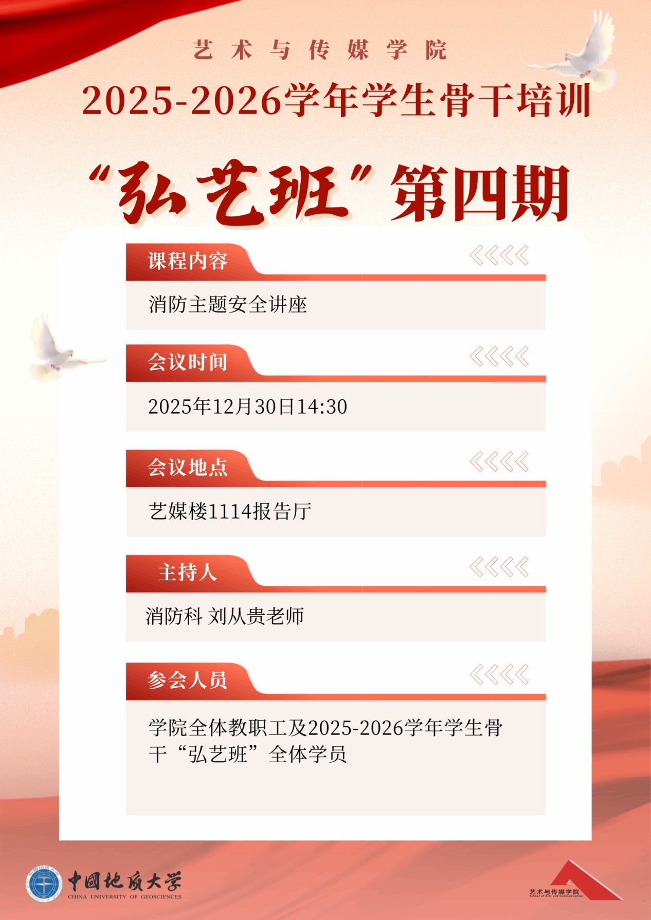 2025年12月30日,williamhill英国在艺媒楼1114报告厅顺利开展2025-2026学年学生骨干培训“弘艺班”第四期,本次消防主题安全讲座由安全保卫部消防科科长刘从贵老师主讲,聚焦于筑牢校园安全防线,助力同学们增强消防意识、提升突发事件应对水平。学院全体教职工,研究生会、学生会、分团委全体学生骨干,各班班委,楼栋长,楼层长,寝室长参加了本次培训。