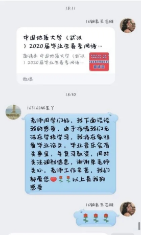 单老师对我班三名同学都进行了毕业情况指导,为我们每位同学都进行了线上学习指导,对我们进行了适当就业和毕业指导,同学们也都对自己的未来有了一定的规划。同学们自己分别在群里讨论了自己关于未来的规划,谈了自己对此次疫情的看法,看得出大家的心态都很好,对我们国家防控能力很有信心。