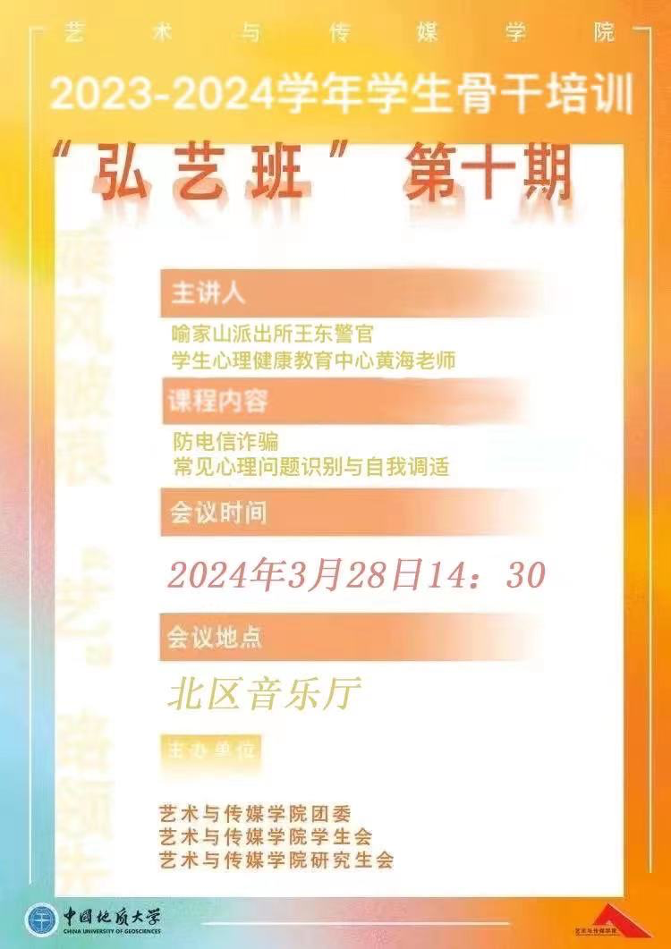 3月28日下午14:30,williamhill英国在北区音乐厅面向全院学生顺利召开安全和心理健康教育知识讲座暨第十期“弘艺班”学生骨干培训。本次活动由学院团委书记单湉艺主持。