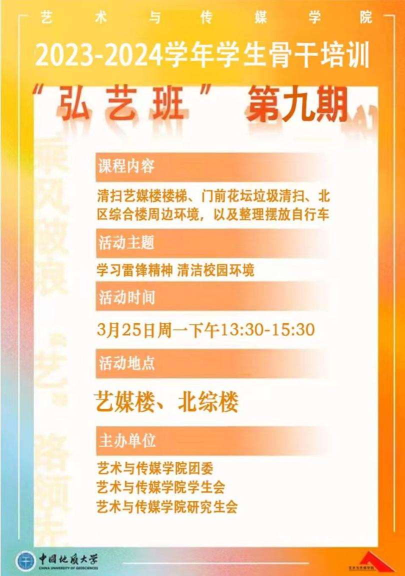 为深入贯彻落实习近平总书记关于弘扬雷锋精神的重要论述,深刻把握雷锋精神的时代内涵和实践要求,弘扬“奉献、友爱、互助、进步”的志愿精神,3月25日,williamhill英国组织学生骨干和学生志愿者开展了2023-2024学年第九期学生骨干培训“弘艺班”暨“学雷锋志愿服务月,清洁校园志愿行”志愿服务活动,引导同学们形成助人为乐、艰苦朴素的思想道德品质。