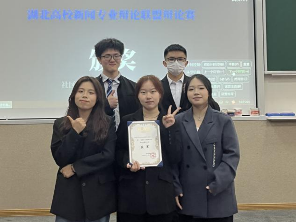我院辩论队在本届“新辩盟”比赛中,共有2022级本科生辩手曹家维、朱金川,2023级本科生辩手汪桂珍、廖紫霜、崔雅莉五位辩手上场,先后战胜来自华中师范大学、中南财经政法大学的辩论队,进入决赛。最终以5比7惜败对手,获得本届“新辩盟”辩论赛亚军。