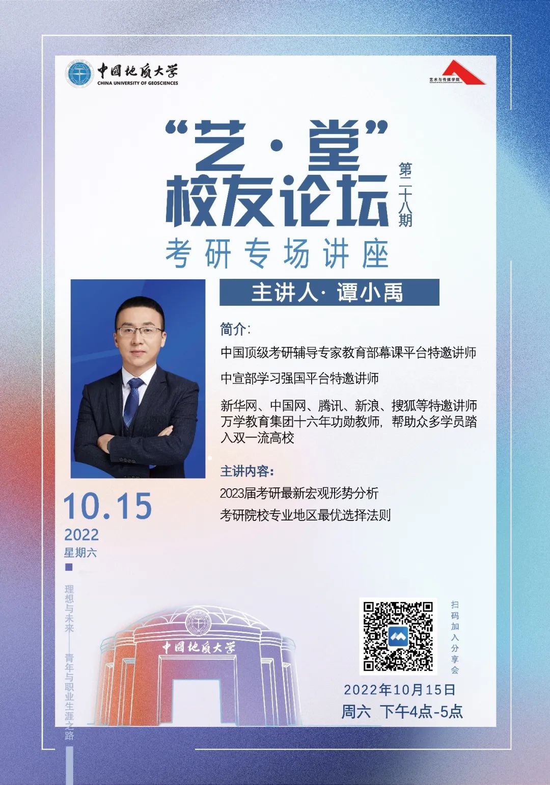 10月15日下午16:00,williamhill英国于线上召开了第二十八期“艺·堂”校友论坛考研专场讲座。中国顶级考研辅导专家谭小禹老师做了主题为“2023届考研志愿选报指导”的讲座分享。