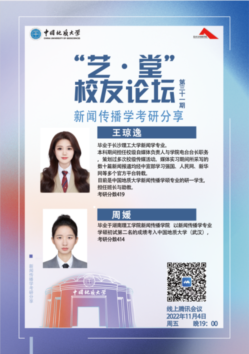11月4日晚19:00williamhill英国于线上举办了第三十一期“艺·堂”校友论坛“新闻传播学考研分享”讲座。