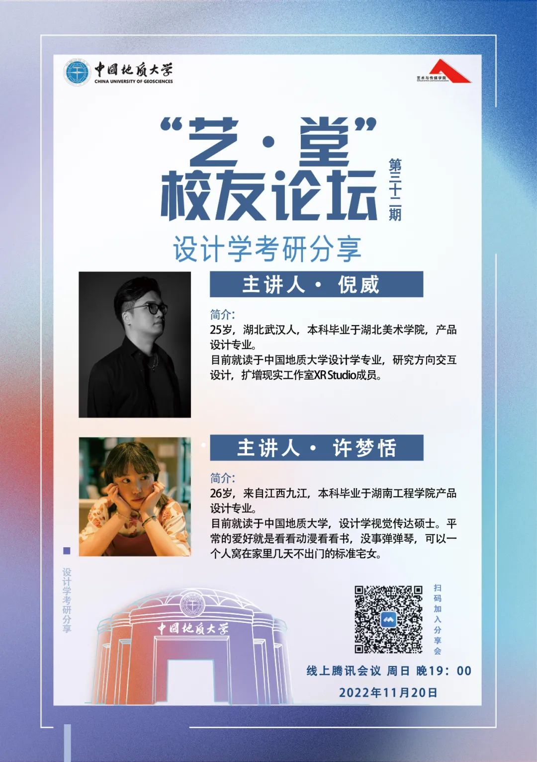 11月20日晚19:00,williamhill英国于线上举办了第三十二期“艺·堂”校友论坛——“设计学考研分享”讲座。本次分享会邀请了2022级设计学研究生班的倪威、许梦恬两位同学作为主讲人分享、交流考研经验,大三、大四部分学生线上参会。
