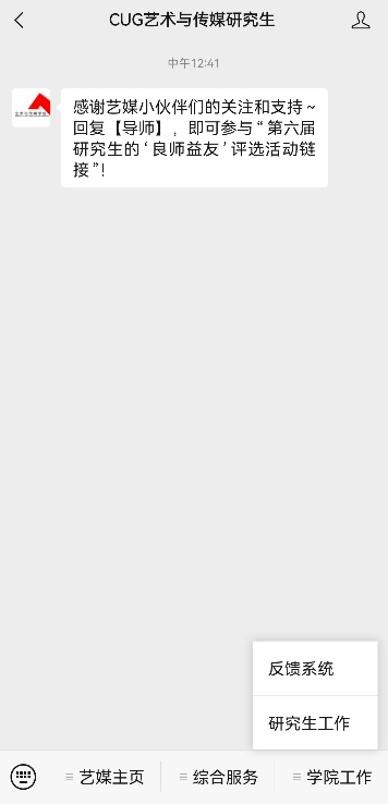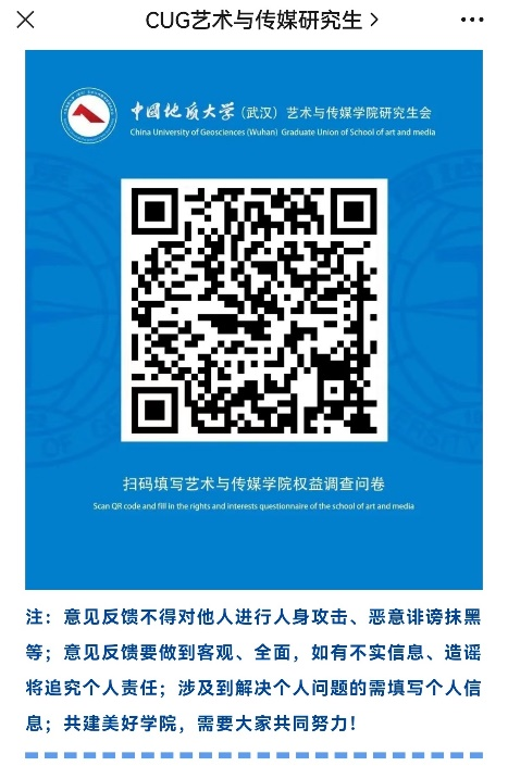 ②网络匿名反馈系统此前已存在并且长期有效,同学们可以搜索我院“CUG艺术与传媒研究生”公众号,进入公众号后台并点击右下方“学院工作”中的“反馈系统”,下滑至最底端可以扫码填写艺术与传媒权益调查问卷。