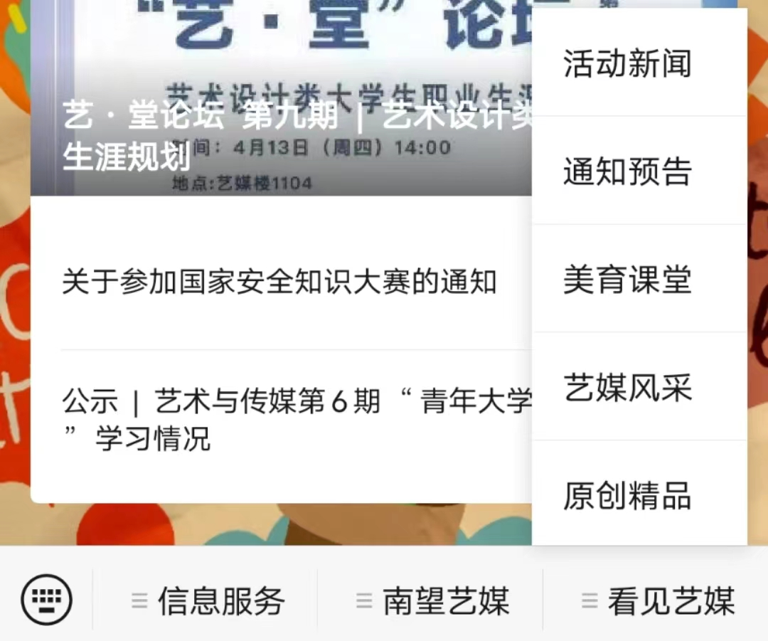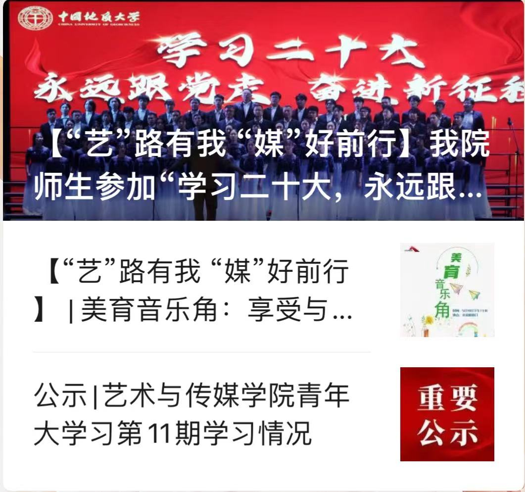 微信公众号“CUG艺媒人”致力于丰富同学们的课余生活,做好各项通知、要闻的二传手,帮助同学们了解学院最新动向以及和自身发展、生活有关的各项事宜。因2021年疫情影响,我院许多活动搁置,但在2022年重新恢复了生机,全媒体中心将每一场会议、讲座的精华、重要内容整理成文稿的形式在CUG 艺媒人公众号上发布,供大家快速了解。