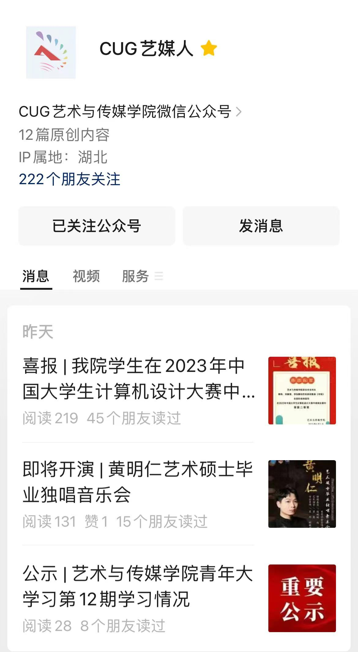 微信公众号“CUG艺媒人”菜单栏经重新设计改版后,现设有3大栏目,分别是信息服务(迎新地图、就业信息)、南望艺媒(学院简介、院会家庭、学术交流、科技成果)、看见艺媒(活动新闻、通知预告、美育课堂、艺媒风采、原创精品),“CUG艺媒人”在2022年1月1日-2022年12月31日共发布402篇推送,按照具体内容可分类为9个板块(活动新闻、通知预告、转载内容、艺·堂、艺媒风采、精彩图集、人物专访、节日特辑和原创精品),总阅读量为13.4万,粉丝数量为4904。同时,公众号已开通视频号“cug艺媒人”,2022年共发布原创视频39个,总播放量为38977,其中原创视频《在场》、《拾年支梦》以及学院师生参与央视《合唱先锋》节目录制系列视频的播放量均在5000+,获得学院师生的一致好评。