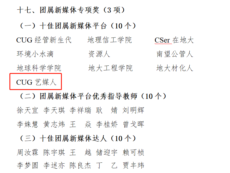 在学校近期“五四评优”活动中,我院官方微信公众号“CUG艺媒人”以特色鲜明的版式设计、持续性的优质内容输出、准确的角色定位等荣获“十佳团属新媒体平台”、全媒体中心王越荣获“十佳团属新媒体达人”、曾戈晖荣获“团属新媒体平台优秀指导教师”。
