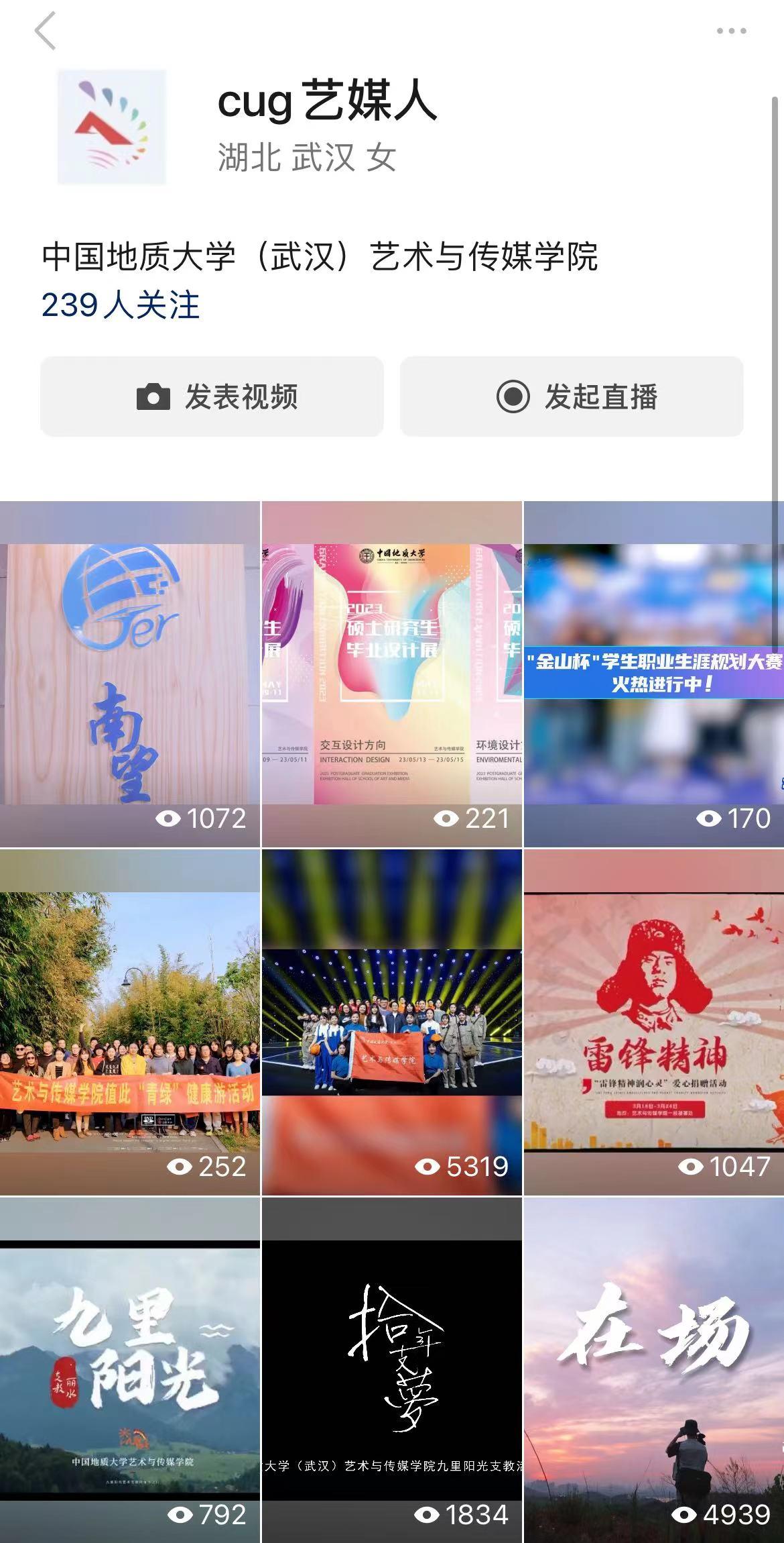 新媒体时代,CUG艺媒人不再只运营公众号,去年开设的视频号的“cug艺媒人”,在经过一年的精心运营下共发布原创视频39个,总播放量为38977,在当下短视频流行的年代,创新和丰富了新媒体作品的表现方式,记录艺媒人的点滴生活,留存珍贵回忆。如:《拾年 支梦》williamhill英国九里阳光支教活动纪录片、《万疆》、我们的军训时光Vlog,视频数据量均在5000+,学院师生频频点赞互动。