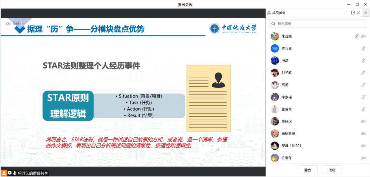 课程第一讲,艺术与传媒研究生辅导员单湉艺老师针对当前就业形势与政策及其扩展内容进行详细讲解,对学院基本概况及毕业生就业情况、就业业务知识与就业管理工作、各类有效求职渠道以及多样化的就业类型做了具体介绍,号召同学们把握秋招机会。