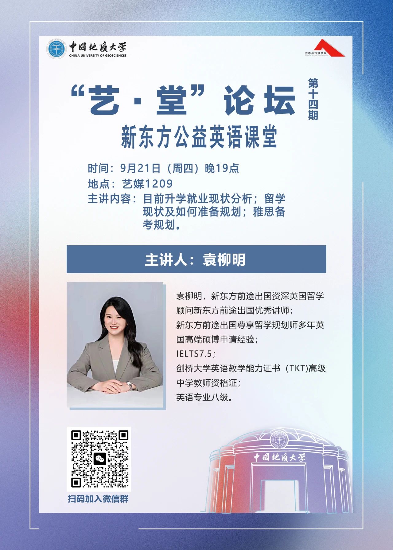 2023年9月21日晚上19:00,“艺·堂”论坛第十四期在艺媒楼1209顺利召开。新东方教育科技集团有限公司武汉分公司讲师袁柳明围绕当今就业现状、出国留学状况和雅思备考规划进行了生动有趣的讲述。