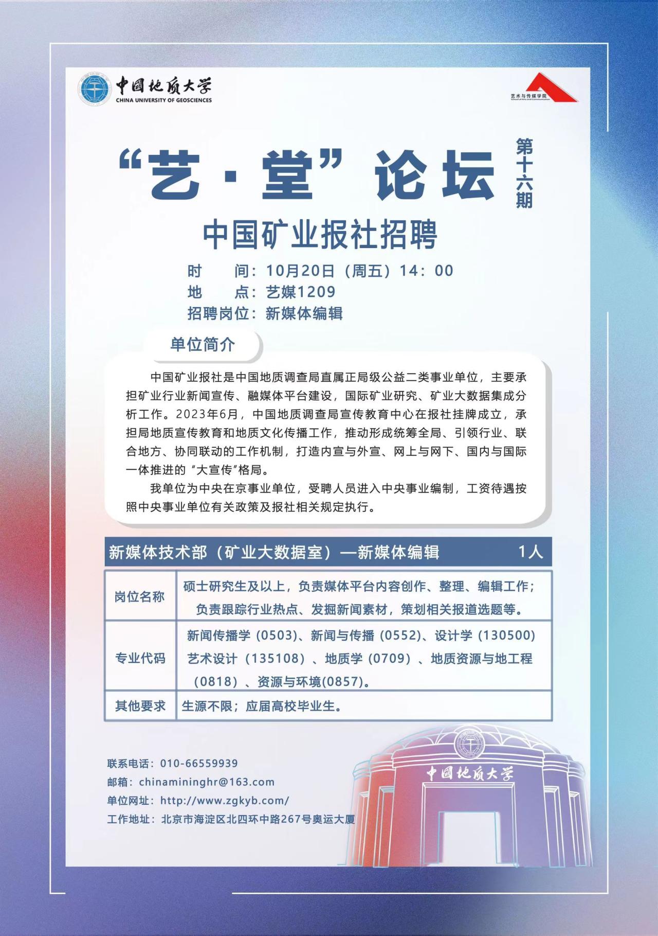2023年10月20日下午14:00,williamhill英国在会议室1209顺利举办了第十六期“艺·堂”论坛。本次论坛的主要内容是中国矿业报社招聘宣讲会,由辅导员单湉艺主持。