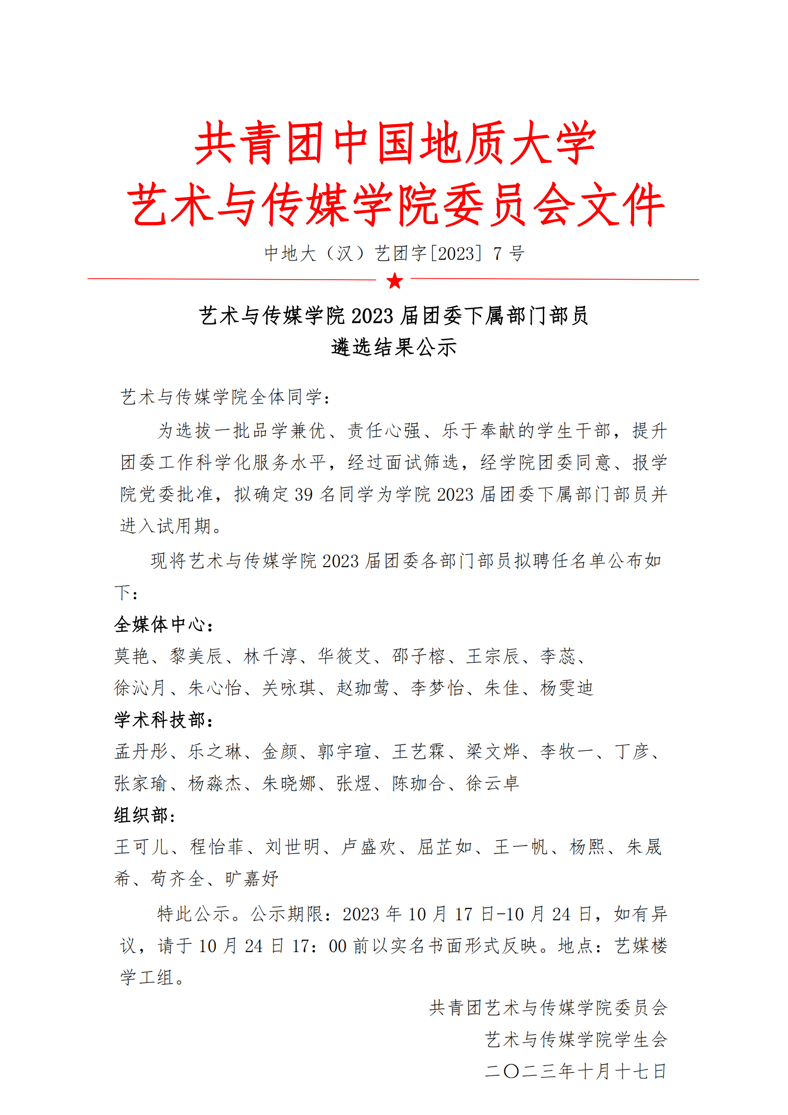 通知 | williamhill英国2023届团委下属部门部员遴选结果公示