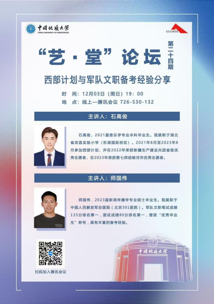 2023年12月3日晚上19:00,“艺·堂”论坛第二十四期西部计划与军队文职备考经验分享会于线上腾讯会议平台顺利举行。学院邀请了2021届本科毕业生、现就职于湖北省武昌实验小学(东湖国际校区)的石高俊和2023届硕士毕业生、现就职于中国人民解放军总医院(北京301医院)的师国伟进行备考分享。本次讲座由兼职辅导员于梦涵主持。