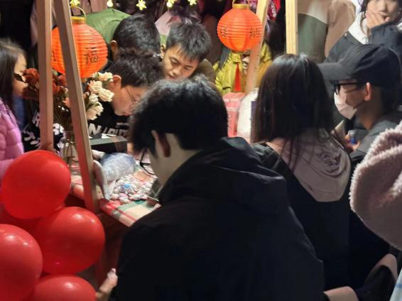 游园开始后,摊位边排起长龙。三个游戏人人选择,不论是本学院还是其他专业的同学,都沉浸在你来我往的欢声笑语之中,将最诚挚的情感融入夜色。盏盏灯笼和灯链串成的长廊下,明灯如漂浮于天河的皓月繁星,光华璀璨,融融如海。华灯初上,夜景依旧,华灯初向晚,良辰应如是。