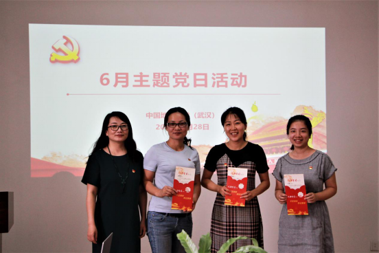 本次主题党日活动增加了为6月份入党的正式党员过“政治生日”这一环节。为孟科、狄丞等8位6月份入党的党员教师过了富有意义的“政治生日”,发放“政治生日”纪念卡,他们深有感触的回顾了各自的入党历程。新闻与传播党支部孟科老师是一位有着32年党龄的老党员,恰逢今年退休,支部为他准备了鲜花,孟科老师说,入党32年以来,常常感叹党从一艘红船、一面红旗开始领导我们建设美好中国,到如今取得了辉煌成绩实属不易。年轻人也要加强政治学习,为实现中国梦而努力奋斗。