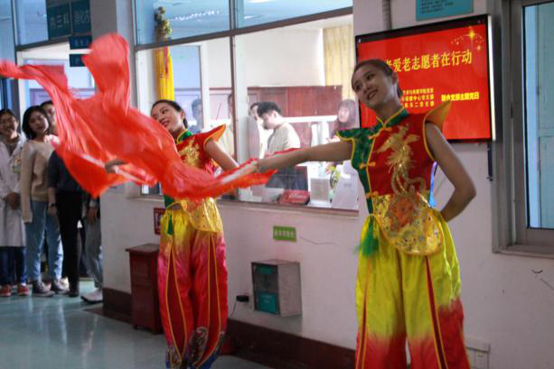 随后学院的党员师生为老人们表演了精彩的文艺节目,节目形式多样,精彩纷呈,不仅有传统的舞蹈、合唱,还有独唱、乐器演奏及朗诵,丰富的节目赢得了观众们的阵阵掌声。其中一位来就医半年几乎很少说话的老人表示,师生们的演出很精彩,内容紧跟时代,贴近老年同志,看了很受感动,希望以后多安排这样的活动。