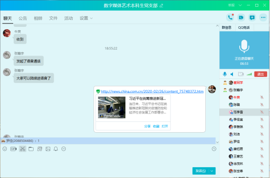 2020年2月27日晚上7点,因疫情原因在数字媒体艺术本科生党支部QQ群召开2月份“支部主题党日”。