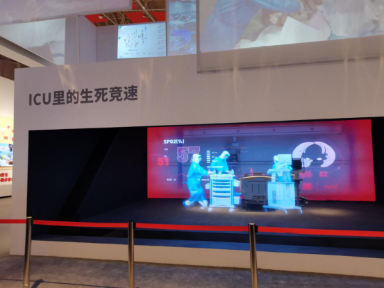 “滴!滴!滴!”屏幕中显示血氧饱和度76、72、68、59……在“生死阻击 艰苦卓绝”单元,一台全息投影仪还原了ICU病房里生死救援的尖峰时刻。光影形成的医护人员与时间赛跑,在现场,你能近距离看到ECMO设备中,血液在透明导管里流动,心弦不断紧绷,而最开心的正是那句“你活过来了!”