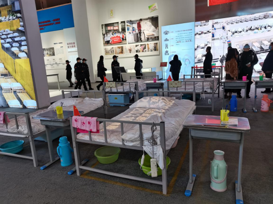 还有实景复制的武汉客厅方舱医院,墙上那一一张笑脸和加油的漫画,静默的图书角,在方舱里跳广场舞的剪影还有桌上的暖水瓶,无不在低声细述着曾发生在那里的感人故事。