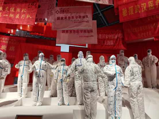 展览馆里摆放着一排排写满人名的防护服,展厅上空挂满了援鄂医疗队的队旗,国家援鄂医疗队、北京协和医院援鄂医疗队、江西省援鄂医疗队……耀眼的红色,恰似他们在至暗时刻送来的光和热,不知不觉让人看了眼眶一热。