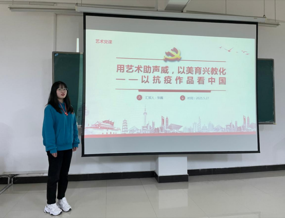 2021年5月27日中午12时30分,党支部于艺媒楼1312室召开了艺术党课分享活动。党支部张巍同志以《用艺术助声威,以美育兴教化——以抗疫作品看中国》为主题,将美育与艺术党课相结合,通过“PPT讲述+短视频放映”的方式带领支部党员共同重忆了抗疫之路,领悟了中国特色社会主义制度优势,弘扬了伟大的抗疫精神,为党支部全体党员上了一节生动形象的艺术党课。